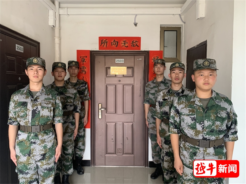 学校里,经常有同学来参观这间寝室,是名副其实的校园“网红寝室”。寝室门口,挂着一块“光荣之家”牌。推门而进,有一面贴满6位同学军旅生活的照片的文化墙。