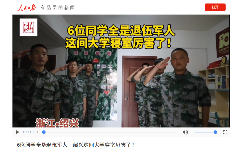 上一条:浙江新闻:红色故事搬上舞台 师生自编自导自演舞台剧《俞秀松》 下一条:人民网:厉害了!浙江一大学寝室6位同学全是退伍军人