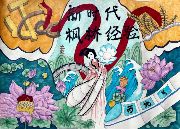 环设(三校)18级陈梦旭、陈鑫旦、兰徐颖三位同学合作手绘了作品《盛世如画,续写辉煌》。“因为诸暨拥有丰富的红色资源,所以我们想到融入地方文化,加入荷花、西施、珍珠、西施号、苎萝亭、浮桥、枫桥经验、红丝带、党徽、“100”、同山烧等诸暨元素,麦穗是用来致敬逝去的伟人,整幅作品表达了我们对党的无限热爱和衷心的祝福。”