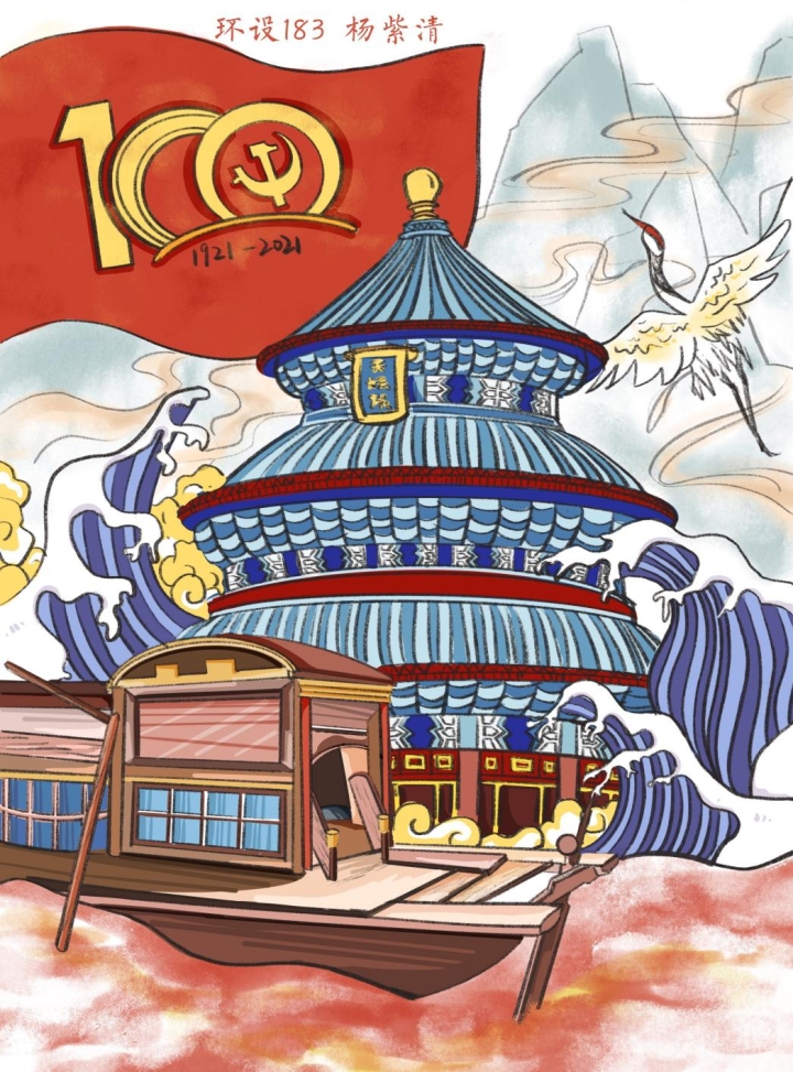 环设18级杨紫清:“我绘画的是《启航新征程》,红船寓意中国革命扬帆起航,天坛表达对中华优秀传统文化的认同感和自豪感,山河白鹤寓意中国共产党在人民心中屹立不倒。”
