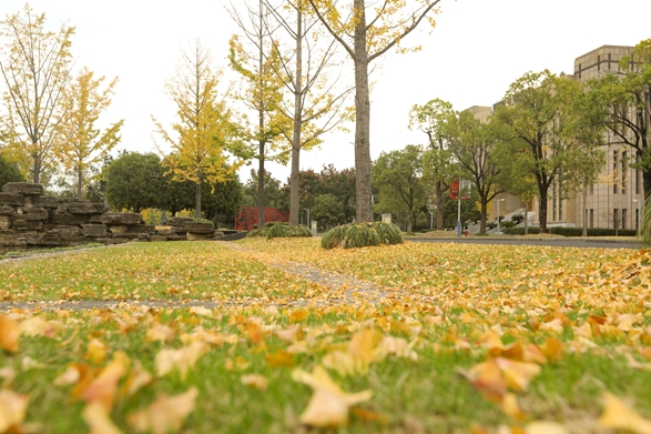 自古逢秋悲寂寥,暨阳秋日胜春朝。校园里的秋意是银杏大道两侧银杏树叶上的一抹黄,澄清小湖上曲折有致的一道桥,是远处可见古色古香的陶朱亭,清晨叶缝中细碎的曦光,更是傍晚笼罩学院如烟似纱的余晖。从初到末,它都懒卧在暨阳这张温床上,如此温柔,令人心醉。