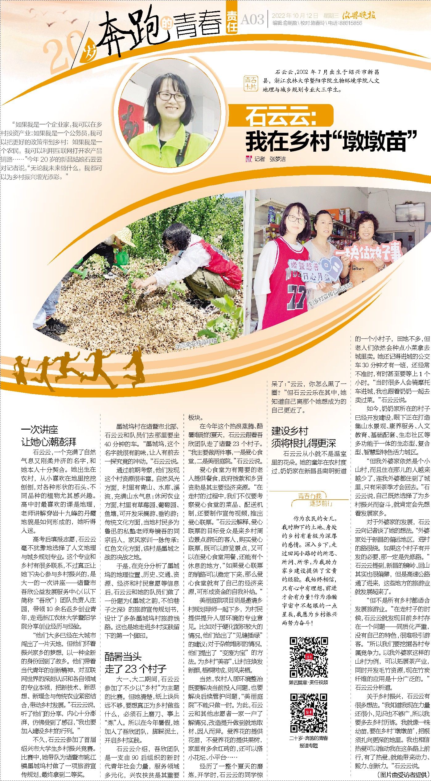 “如果我是一个企业家,我可以在乡村投资产业;如果我是一个公务员,我可以把更好的政策带到乡村;如果我是一个农民,我可以利用互联网打开农产品销路……”今年20岁的新昌姑娘石云云对记者说,“无论我未来做什么,我都可以为乡村振兴增光添彩。”