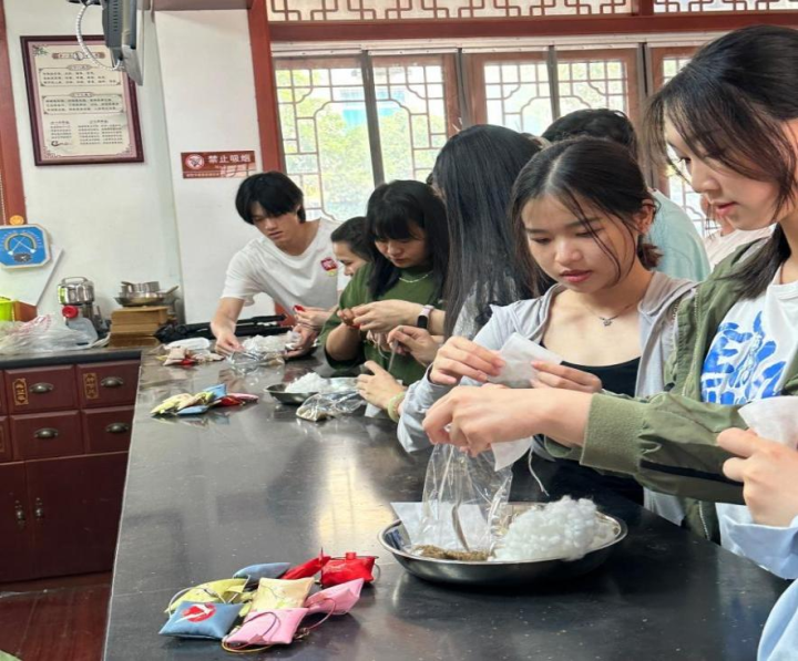 活动中,师生党员们在暨南街道社区卫生服务中心中医馆精心制作香囊,采用藿香、艾叶、肉桂、山奈、苍术等药物粉碎成药粉,制成的香囊袋剂,可以起到驱蚊、防虫、防感等功效。党员们通过制作香囊的过程,将自己的心意和祝福融入到每一个香包里,不仅感受了传统习俗的魅力,也体会了劳动带来的成就感。