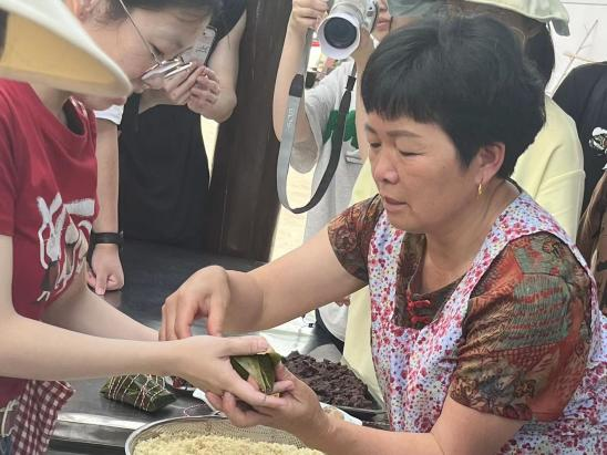 马剑灰汤粽制作技艺成名已久,被列为《诸暨市第八批非物质文化遗产代表性项目名录》,在端午节来临之际,同学们也向状元村的村民学习包粽子,在老师傅的帮助下,折叶、放原料、包裹、定型、捆绑、修整,逐步体验包粽子的乐趣,感受传统食物的独特魅力。同学们还将专业设计的“福”字送给村民。此次劳动教育实践活动让同学们切实感受到了乡村生活,也充分体验到了劳动带来的收获,深刻领略到了劳动教育的意义。