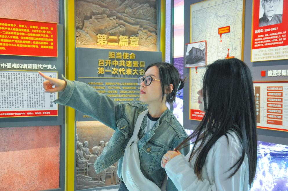 中共诸暨县“一大”会址位于诸暨市暨阳街道郭家坞自然村,1927年9月,中共诸暨县第一次代表大会在此召开。师生党员早早到达展馆,以一片片红色水洗石墙体为线索,通过情节引领,或前行或回望,感受红色之所的精神引领。