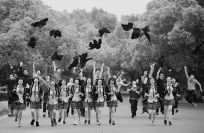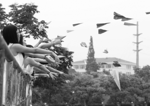 在毕业前夕,台州学院外国语学院的一群2015届毕业生身着小礼服,在校园里放飞象征着希望和青春的纸飞机。(本报通讯员 林彦琨 摄)