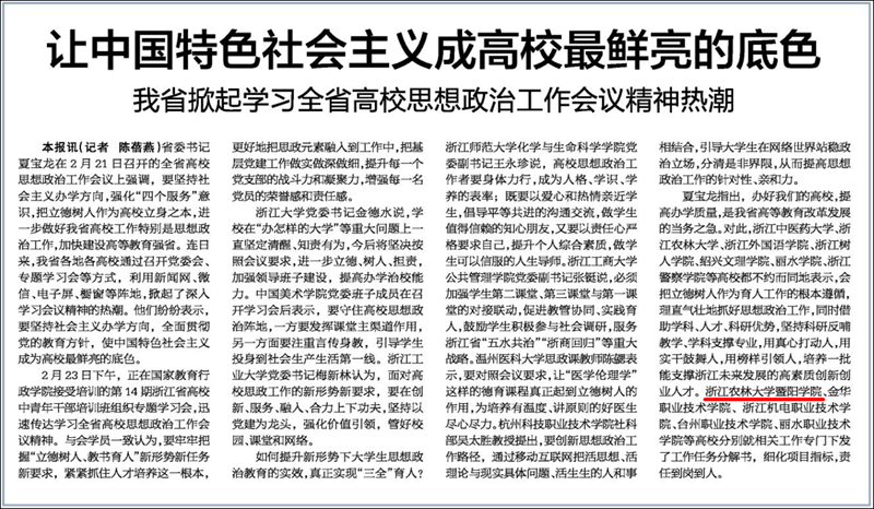 浙江教育报3月1日讯 让中国特色社会主义成高校最鲜亮的底色 我省掀起学习全省高校思想政治工作会议精神热潮