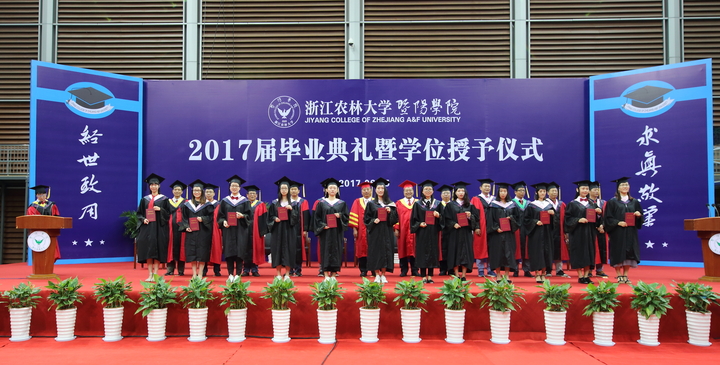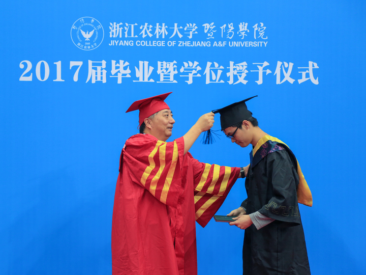6月15日上午,必赢766net手机版举行2017届毕业典礼暨学位授予仪式。浙江农林大学副校长金佩华和必赢766net手机版院长石道金为每一位毕业生拨穗、颁发毕业证书和学位证书,并合影留念。