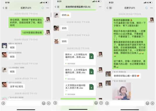 第一分身,独上高楼,做好疫情防控的放哨人。教育部长陈宝生曾说,辅导员是思想政治工作的主攻手、学生管理的主导者、学生成长的主心骨,在当前这样的特殊时期辅导员又当起了校园疫情防控的放哨人。1月22日必赢766net手机版第一次召开疫情防控紧急会议,根据上级防疫工作要求,当天辅导员接到指令,开始迅速排查老家在湖北及与湖北同学有接触的学生,并汇成新冠病毒感染肺炎疫情防控工作日报表上报。也是在这一天,我开始向同学们第一次发出了信号,提醒同学们避免与武汉回来的人接触,同时劝阻预赴武汉的学生,开启了每日询问同学们各种信息的日常。每天早上睁眼第一件事不是起床,而是拿出手机询问班级同学今日情况。1月26日浙江省启动一级响应机制,绍兴市也启动了一级预案,当天人文学院官网发出寒假学生不提前返校通知,并取消返校留宿安排,取消校内外举行的所有教学、学习、实践、实验等活动,由此可见,疫情已开始升温。1月29日接到上级指令,掌握所带的每一位学生当日的动向和身体情况并汇总记录上报;2月4日召开了学工线疫情防控钉钉视频会议,明确了当前防控疫情是一切工作的重点。2月6日开始实施我是校园每日健康上报,辅导员们又一声哨令,通知和指导自己的学生正确导入基础信息,并开始每日督促提醒同学们规定时间健康上报,并在数据上报后查看学生情况,跟踪了解详情。2月19日再次发出哨令,告知自己的学生每人都要领取绍兴健康码,上报健康码颜色,并每天询问领到红码的同学颜色是否变化。就是在这一声声哨令下,辅导员第一时间将疫情动态上传下达,也是在这一声声急促的哨令下我们迅速掌握了每一位学生的情况,过程中也有心塞,但更多的是安心,学生平安健康是我们最大的心愿。