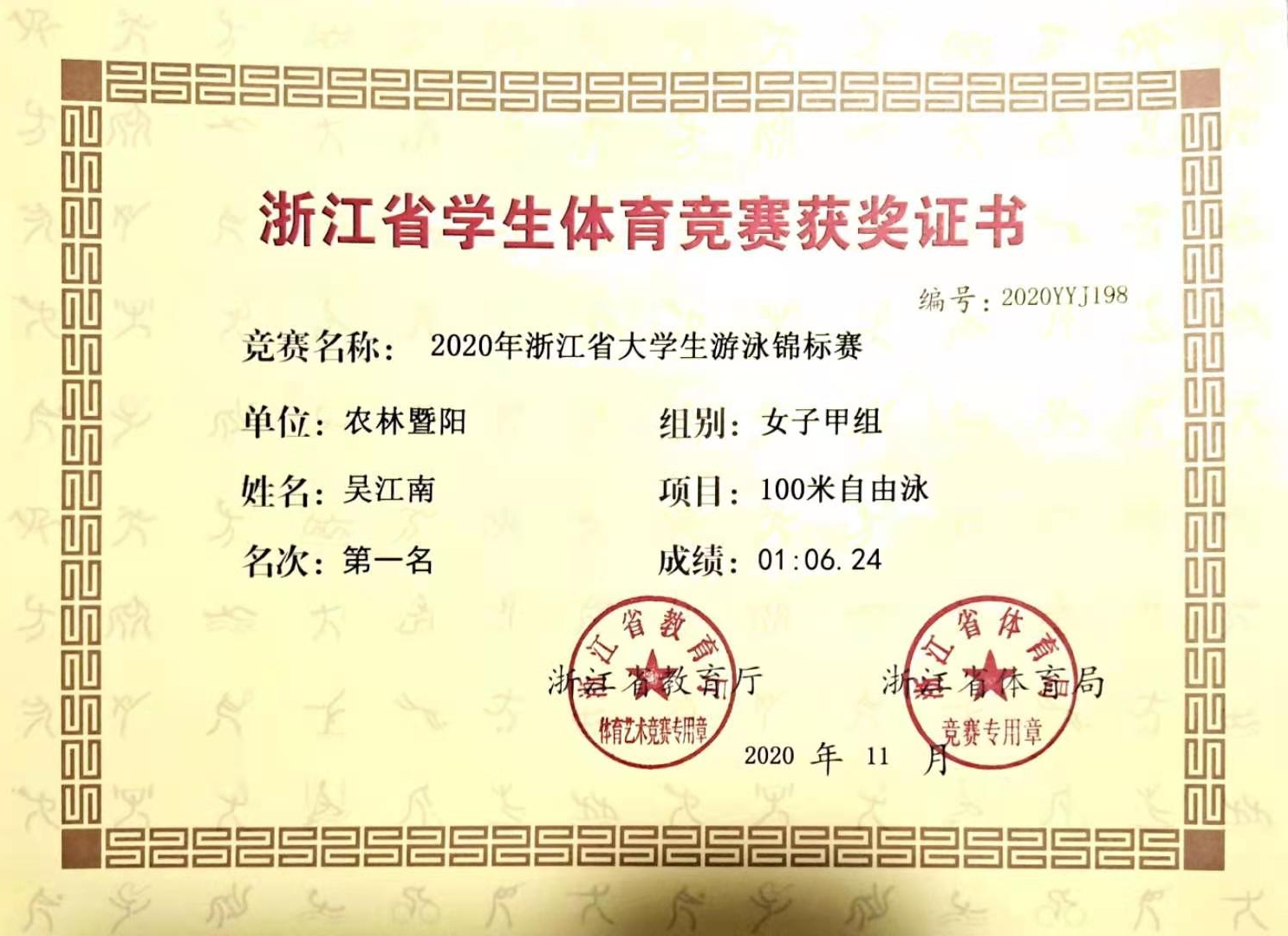 2020年11月12日至11月15日,2020年浙江省大学生游泳锦标赛暨第十四届全国学运会游泳选拔赛在杭州师范大学举行,此次比赛是由浙江省教育厅、浙江省体育局联合主办,是目前省内水平最高的大学生游泳比赛。