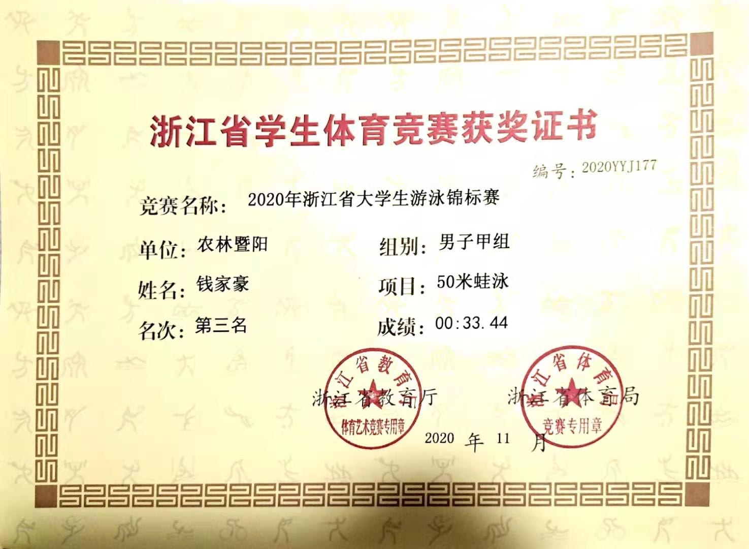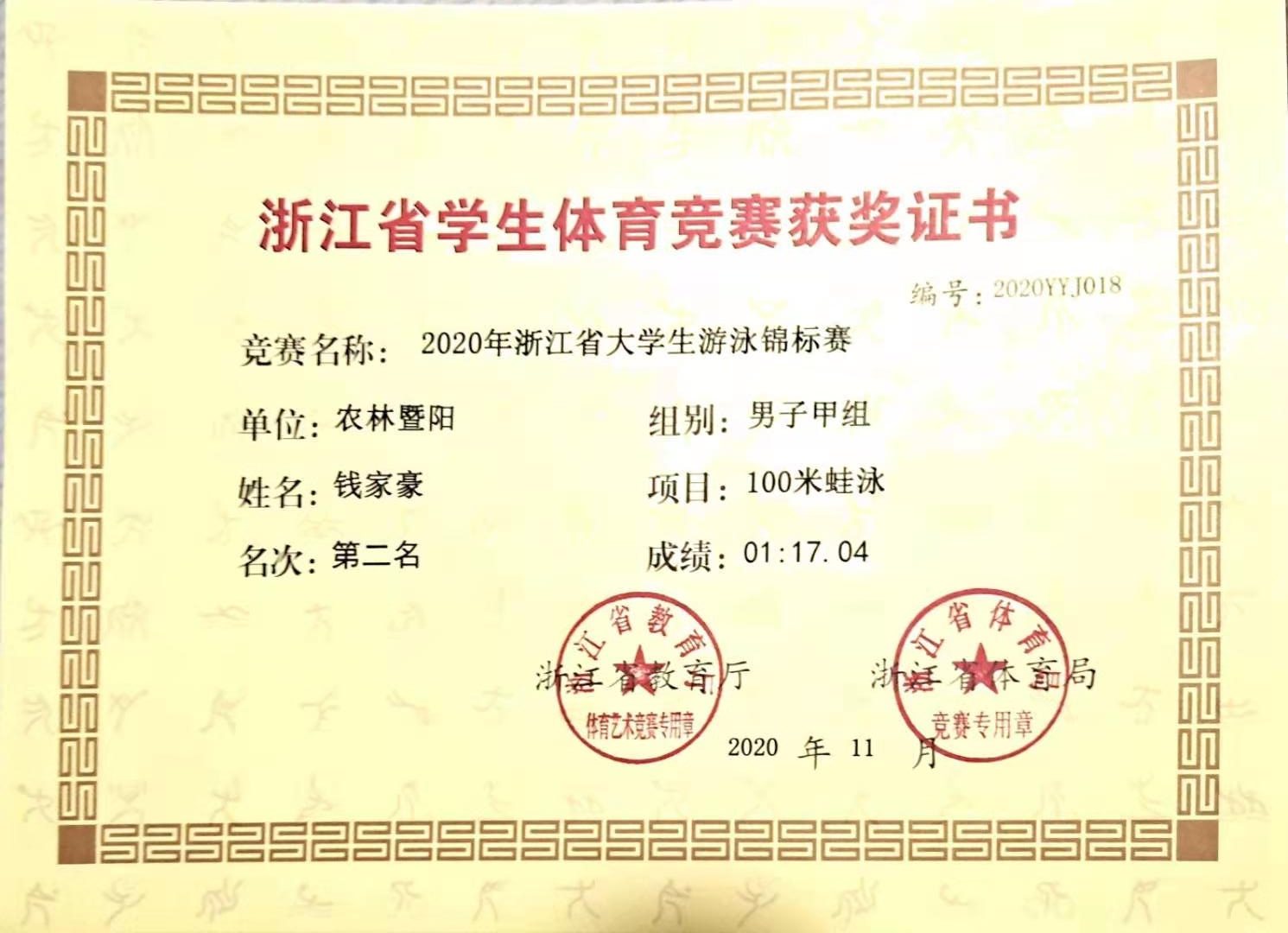 商学院的钱家豪同学在男子甲组100米蛙泳和50米蛙泳分别获得第二名和第三名好成绩。