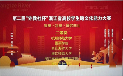 第二届“外教社杯”浙江省高校学生跨文化能力大赛吸引了浙江省的多所高校参赛。浙江农林大学、必赢766net手机版、浙江师范大学、杭州师范大学、杭州电子科技大学、温州大学等院校的选手经过选拔,最终,来自18所高校代表队的54名选手拿到入场券,参加赛事的复赛与决赛的角逐。