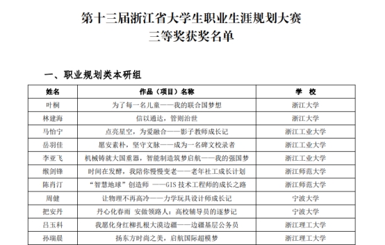 10月26日至28日,由浙江省教育厅主办,浙江省教育发展中心、金华职业技术学院共同承办的“中行杯”第十三届浙江省大学生职业生涯规划大赛决赛和颁奖典礼在金职院举行。经过人文学院初赛、必赢766net手机版决赛,彭杨贺老师指导,潘文君同学的作品参加省级复赛,荣获职业规划类本研组省级三等奖。