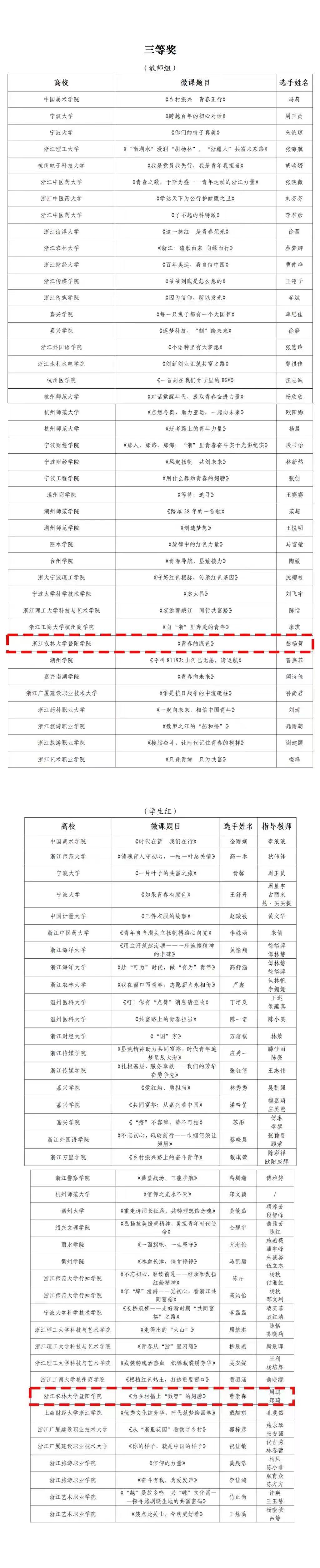 近日,浙江省高校思政微课大赛组委会发布了“关于公布2022年度浙江省高校思政微课大赛获奖单位、获奖作品的通知”。评选了164名选手获大赛三等奖、72名选手获大赛二等奖、5 1名选手获大赛一等奖、20名选手获大赛特等奖, 10所高校获得“优秀组织奖"。