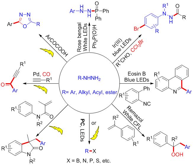 《Organic Chemistry Frontiers》是由英国皇家化学会同中国化学会、中国科学院上海有机化学研究所合作出版,该刊侧重于发表有机化学领域的重大进展,2022年影响因子/JCR分区为5.456/Q1。肼类化合物是有机合成中非常重要的中间体,通常用来制备氮杂环化合物。近年来,他们广泛应用于过渡金属催化的偶联反应,构建各式各样的碳-碳,碳-杂键。最近,肼类化合物已发展作为自由基的前体化合物,应用于光及电催化的自由基偶联反应。