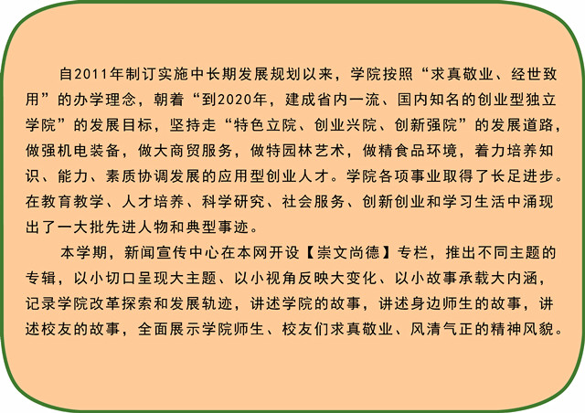 马跃锋:我之前给自己定的目标是拿学校奖学金。这次能够获得国家奖学金,我也是挺幸运的。但这也算是对自己的一个交代,是经过自己的付出与努力所达到的结果。我清楚得知道自己想要什么,各方面要做到什么样的程度,达到什么样的成绩。父母送自己来读书也挺不容易的,所以觉得好好学习拿奖学金也是对父母的一种报答。